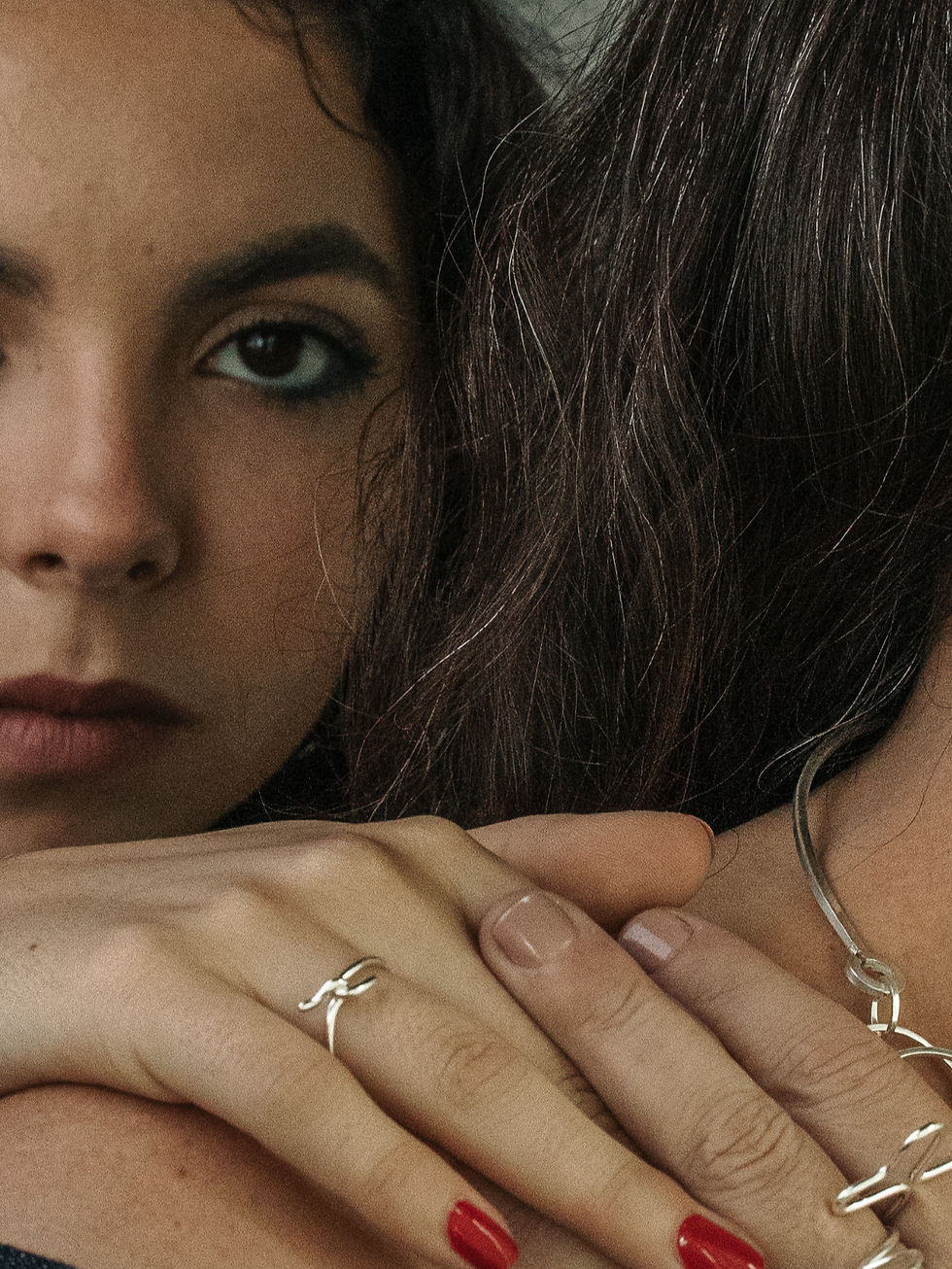 Toda la joyería de esta mini colección fue creada martillando: dando a cada pieza movimiento, diferentes espesores, curvas. Con martilladas precisas, creamos joyas de extrema elegancia, design minimalista y liviano, para ir con todo y lucirlo todo el tiempo. Una pequeña colección apasionada, creada al ritmo de mi martilleo diario.